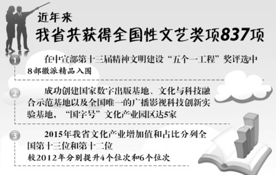 文化产业“强筋壮骨”,整体实力显著增强。成功创建国家数字出版基地、文化与科技融合示范基地以及全国唯一的广播影视科技创新实验基地,“国字号”文化产业园区达5家;2015年我省文化产业增加值和占比分列全国第十三位和第十二位,较2012年分别提升4个位次和6个位次;2015年规模以上文化服务业主营收入占比为 33.24%,较 2012年提高了16.55个百分点;2015年,全省新增文化类高新技术企业95家,占当年全省新增高新技术企业的11.99%;2015年文化产品出口额10.28亿美元,输出版权921项,分别是2011年的2.06倍和1.61倍;截至目前,全省共有28家文化企业上市或在新三板挂牌。