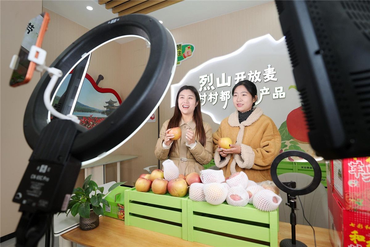 近日, 在淮北市烈山区宋疃镇智慧物流园农产品展销中心的“烈山农场”线上农特产品超市“烈山农场”线上农特产品超市,工作人员在帮助农户直播销售特色农产品。本报通讯员 冯树风 摄