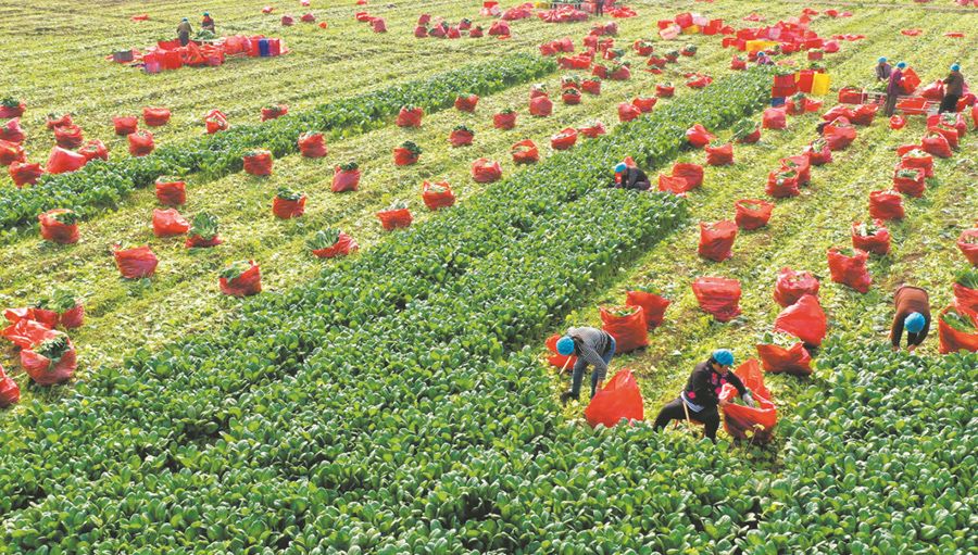 华徽网消息 10月30日,蒙城县小辛集乡农民在蔬菜基地采收小松菜,这些小松菜经过就地加工后将被直接运往上海市场销售。 2019年9月,安徽省首个上海市外蔬菜主供应基地落户蒙城县。目前基地面积已发展到3.5万亩,直接向上海市场供应西兰花、马铃薯、鲜食玉米等新鲜蔬菜。(胡卫国 摄)