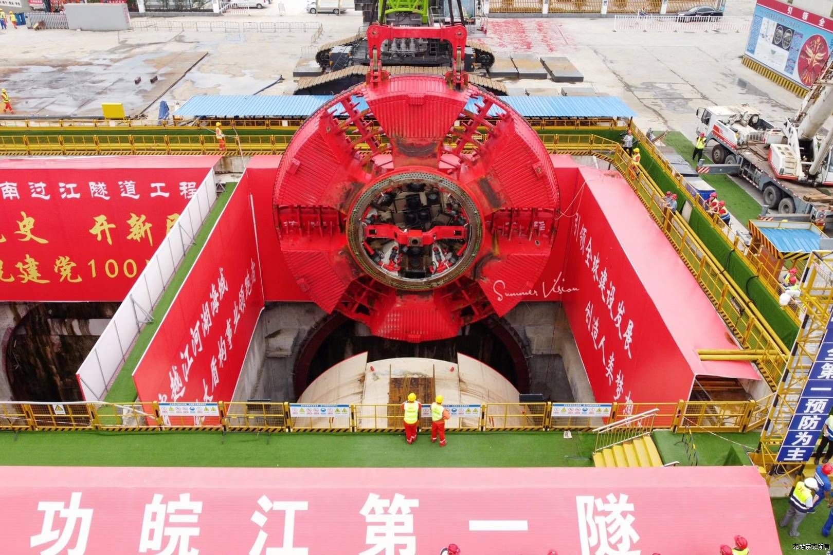 华徽网消息 沈宫石 班慧) 4月26日,有着“皖江第一隧”之称的芜湖城南过江隧道左线盾构机 “皖江复兴号”始发,会同先前始发掘进的右线“皖江奋斗号”盾构机,呈现“蛟龙穿江,双龙共舞”火热施工场景,标志着安徽首条长江隧道进入全面建设阶段。 在2台1250吨和400吨大型履带吊车的共同配合下,历经2个小时,实现刀盘顺利下井,为“皖江奋斗号”盾构机组装重大节点画上完美句号。“皖江奋斗号”盾构机刀盘的顺利吊装,为下一步盾构机始发奠定了坚实基础。