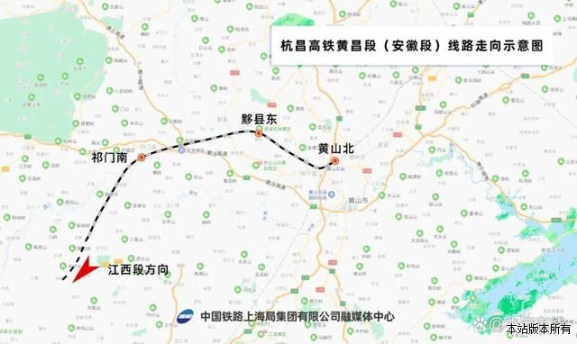 华徽网消息 杭昌高铁黄昌段是“八纵八横”主通道基础上的高速铁路区域连接线,是沟通赣皖两省的重要通道,线路全长约290公里,沿线设南昌东、军山湖、余干、鄱阳南、乐平北、景德镇北、瑶里、祁门南、黟县东、黄山北10座车站,设计时速350公里。其中安徽段约90公里,设祁门南、黟县东、黄山北3座车站。 图片:南昌-景德镇-黄山铁路:安徽段