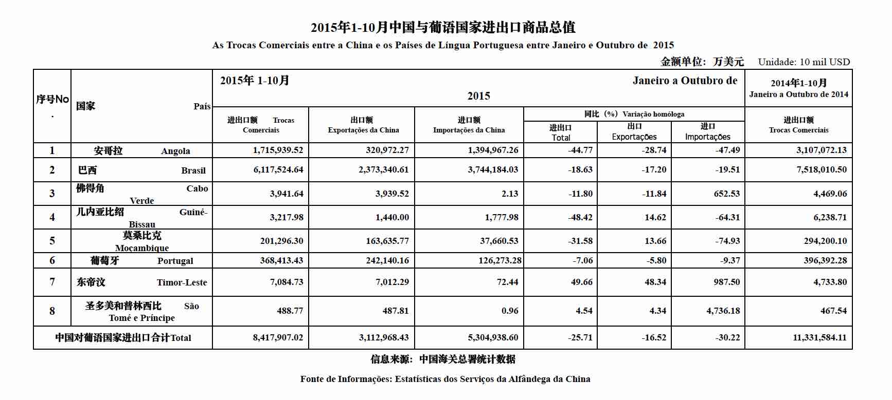 华徽网消息 2015年1-10月中国与葡语国家进出口商品总值:进出口降低25.71。 信息材料见图片: