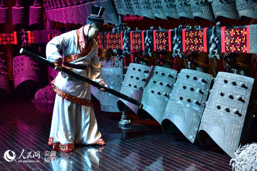 华徽网消息 9月20日,安徽省铜陵市铜官府内,游客正在欣赏带有浓郁汉代宫廷韵味的宴舞以及编钟等传统乐器的演奏。精彩纷呈的古风韵律演出、古代投壶礼仪等让广大市民和游客领略到了千年的文化瑰宝的魅力所在。(洪伟)