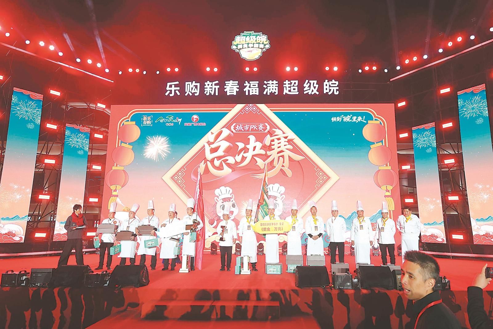 本网信息 2月22日,正月初六,“乐购新春·福满超级皖”主题活动在合肥骆岗公园火热举行。作为活动的“核心引擎”,“超级皖”美食争霸赛总决赛上演巅峰对决,最终淮南队以微弱优势战胜阜阳队,捧起首届赛事桂冠。