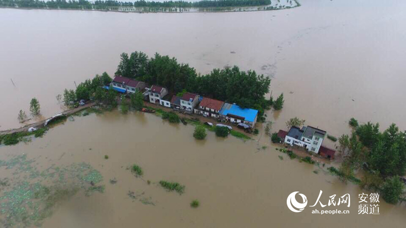 7月4日下午,人民网安徽频道记者来到了这里,浑黄的洪水翻滚着,电线杆和杨树一大截都浸泡在水中,这里已经变成了一片汪洋。从无人机上俯瞰,这些居民楼矗立在水中央,就像一个个孤岛,触目惊心。
